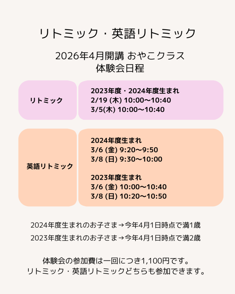 「阿倍野区でリトミック教室を探している」「帝塚山周辺で英語に楽しく触れられる習いごとを始めたい」そんなかたにぜひ知っていただきたい体験会です!